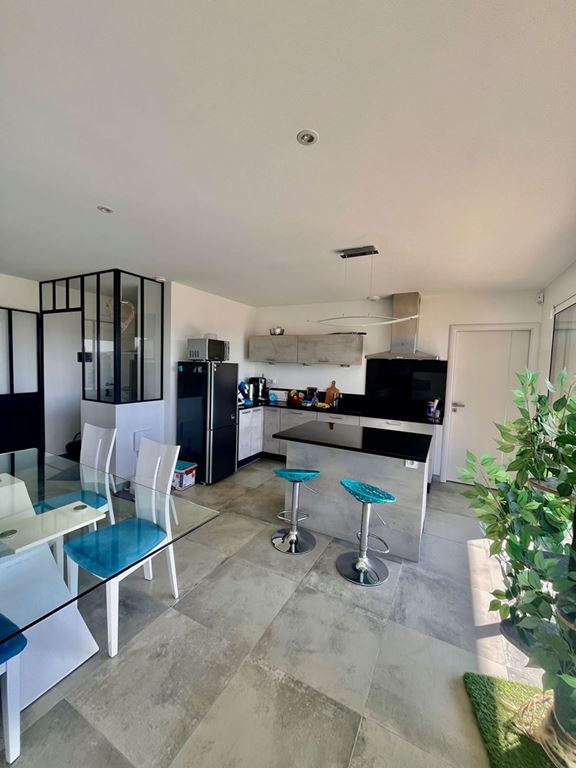 Une entrée avec verrière, une cuisine équipée ouverte sur une pièce de vie de