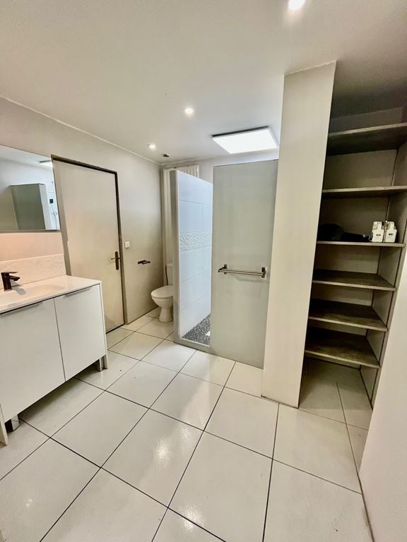 A l'étage : un grand salon, une grande chambre de  25m², une salle de bains (baignoire et douche), wc.